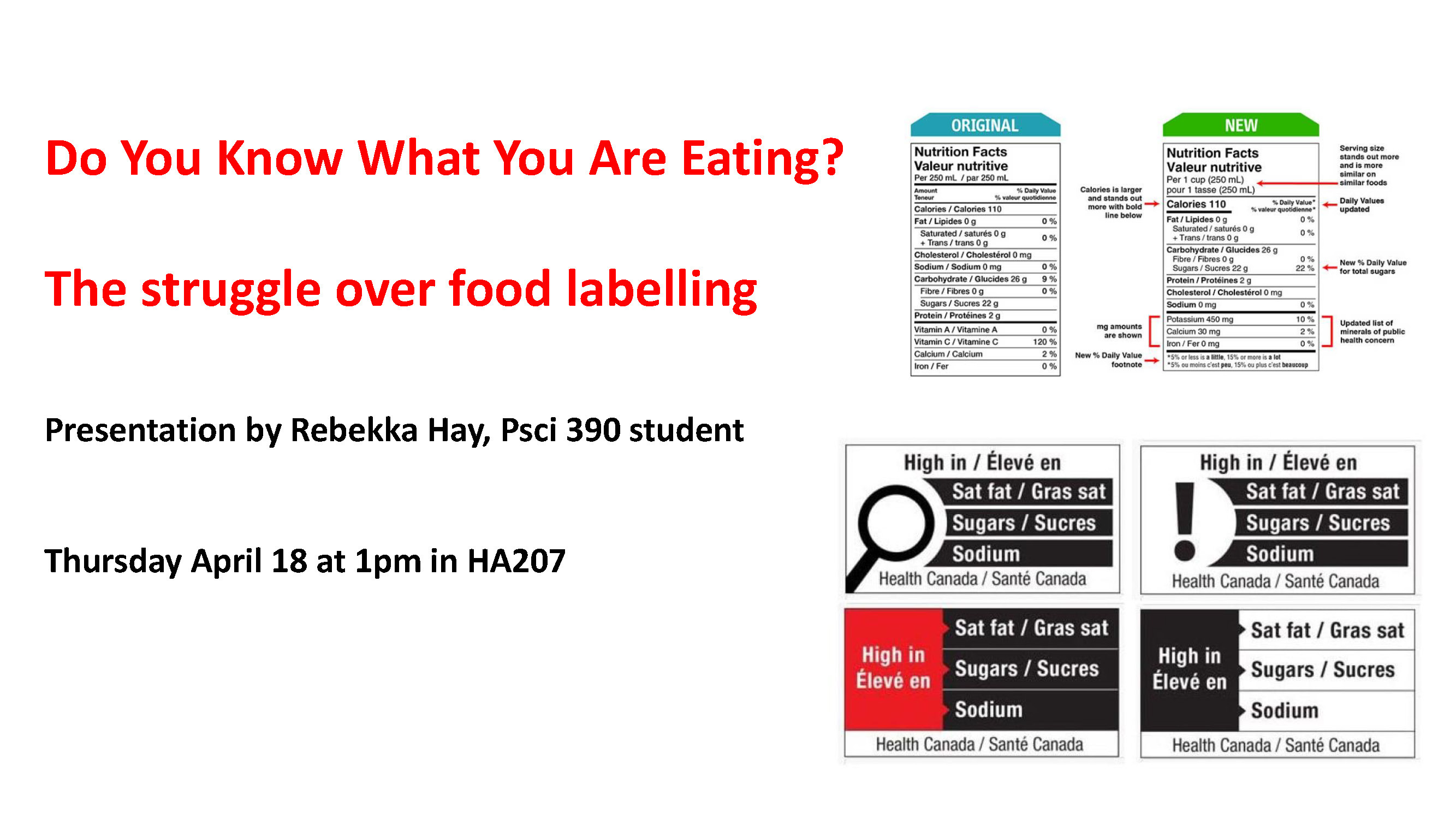 Please attend her presentation, “Do You Know What You Are Eating? The Struggle over Food Labelling” for some thought-provoking insights.