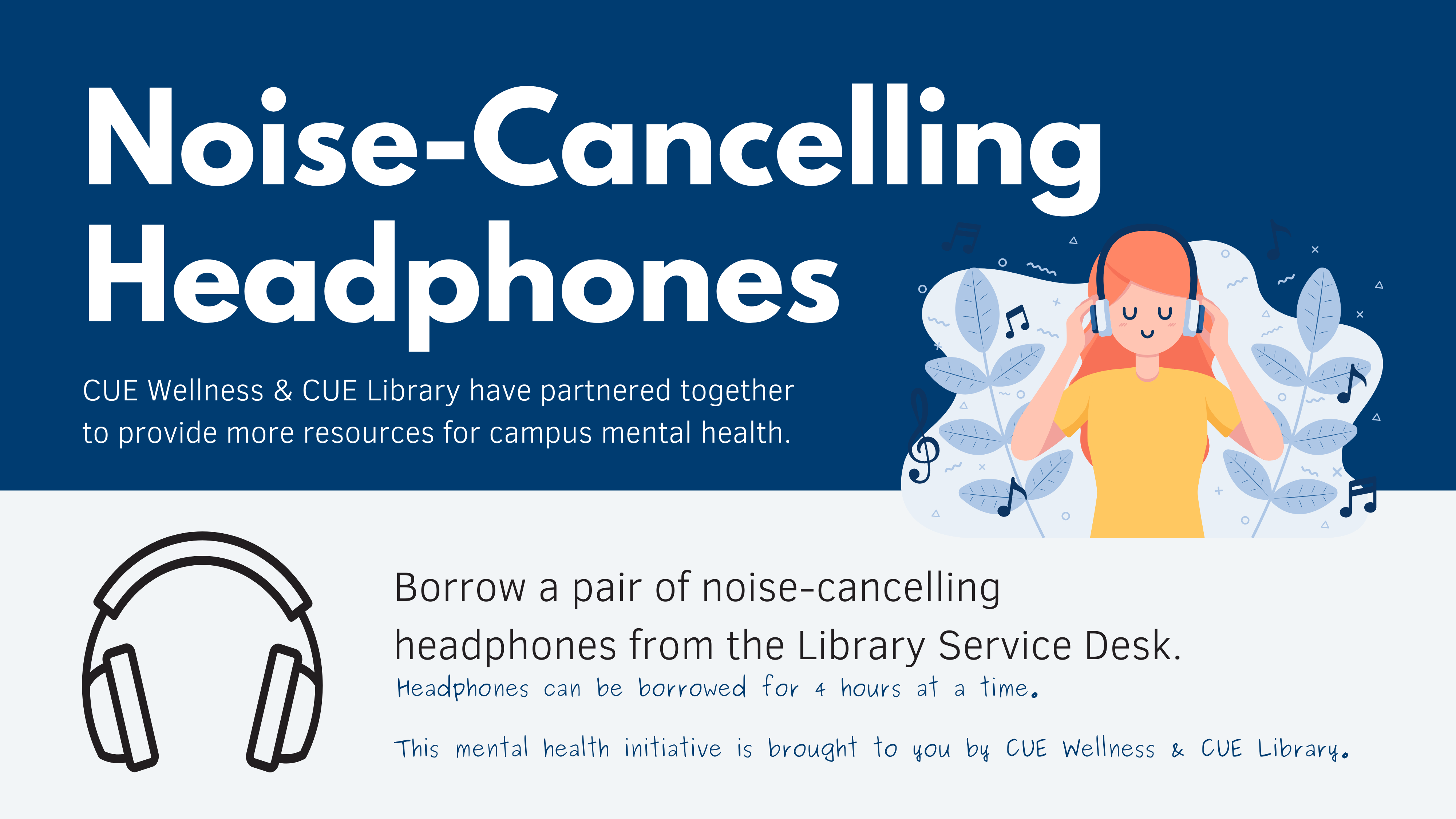 Borrow a pair of noise-cancelling headphones from the Library Service Desk for up to 4 hours at a time.